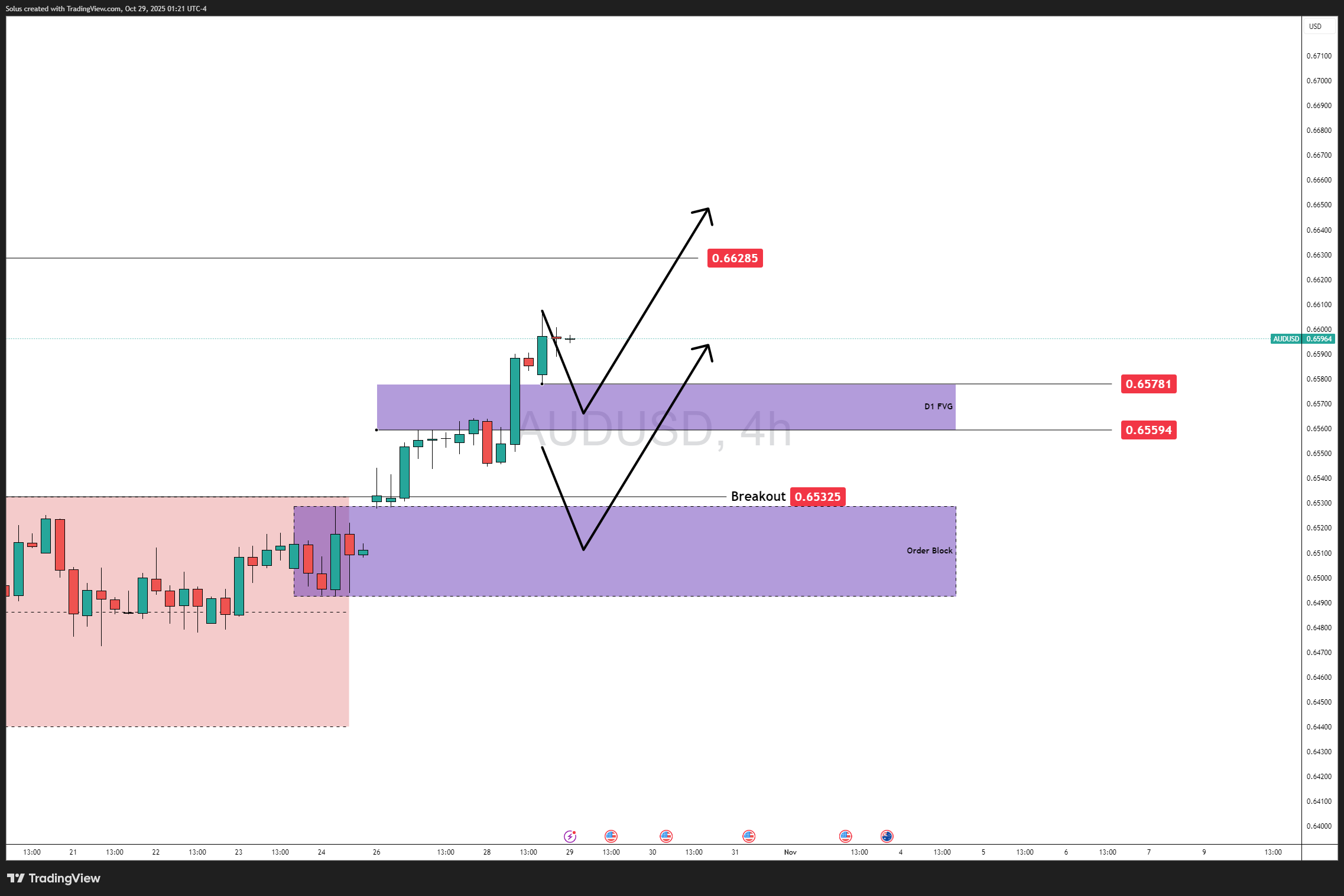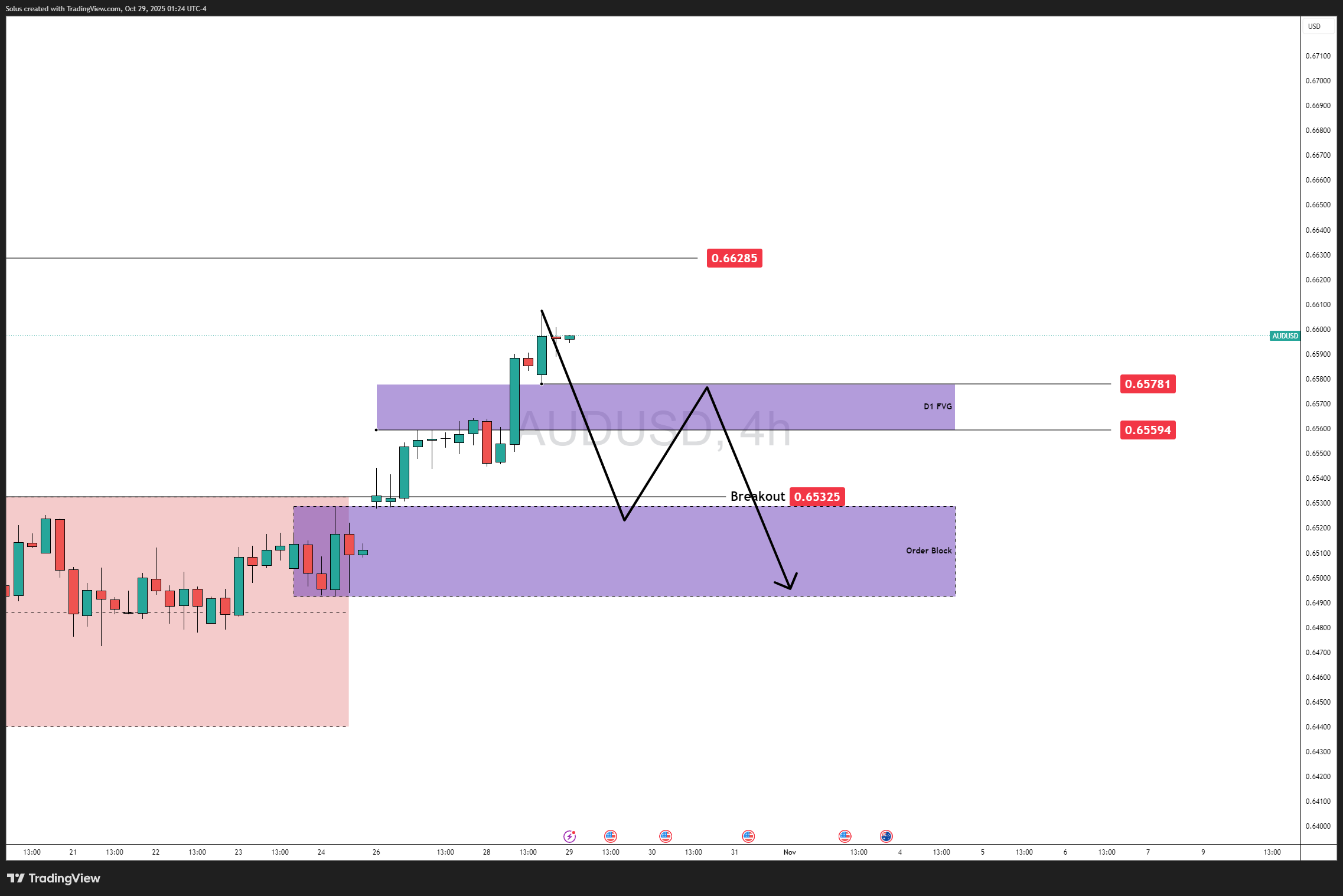 If the Fed delivers a hawkish surprise or the U.S. dollar gains strength, the pair could break below the Daily FVG and revisit the 0.65325 breakout zone.