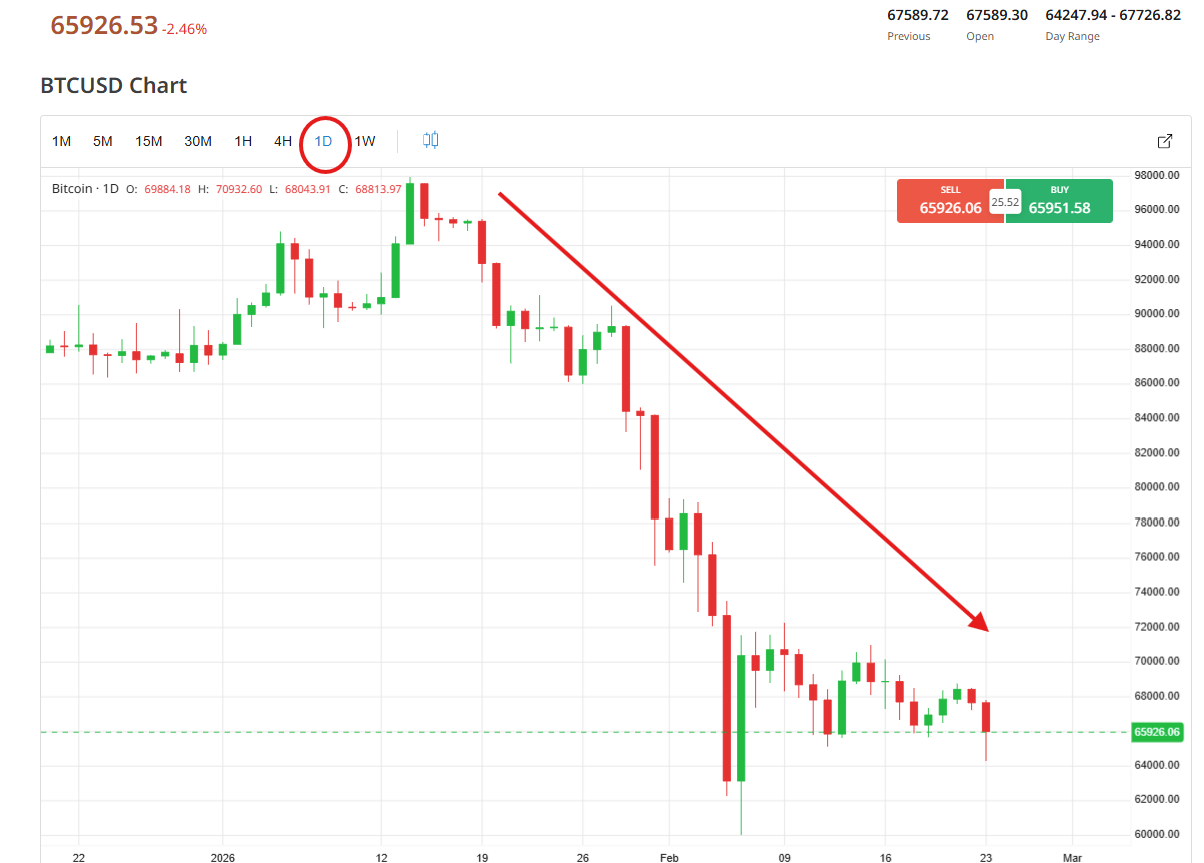 Looking at the BTCUSD 1D chart, the technical picture is starkly bearish. After peaking at six figures, the price has established a relentless descending channel. Note the rejection at the $70,000 level earlier this month; every attempted relief rally has been met with aggressive supply, characterized by long upper wicks and increasing sell volume.