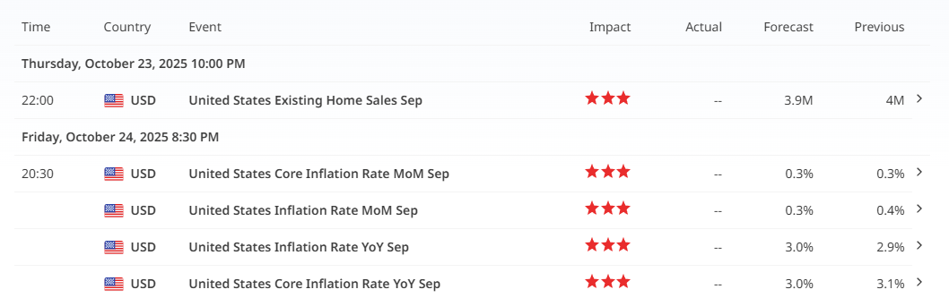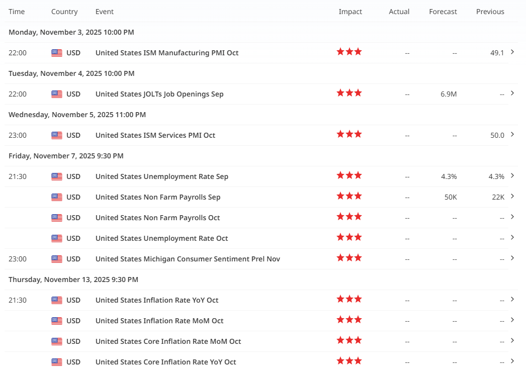 The Nonfarm Payrolls (NFP) report is now pushed to November 7, while the Producer Price Index (PPI), Retail Sales, and Housing Starts are still flagged as “tentative.”