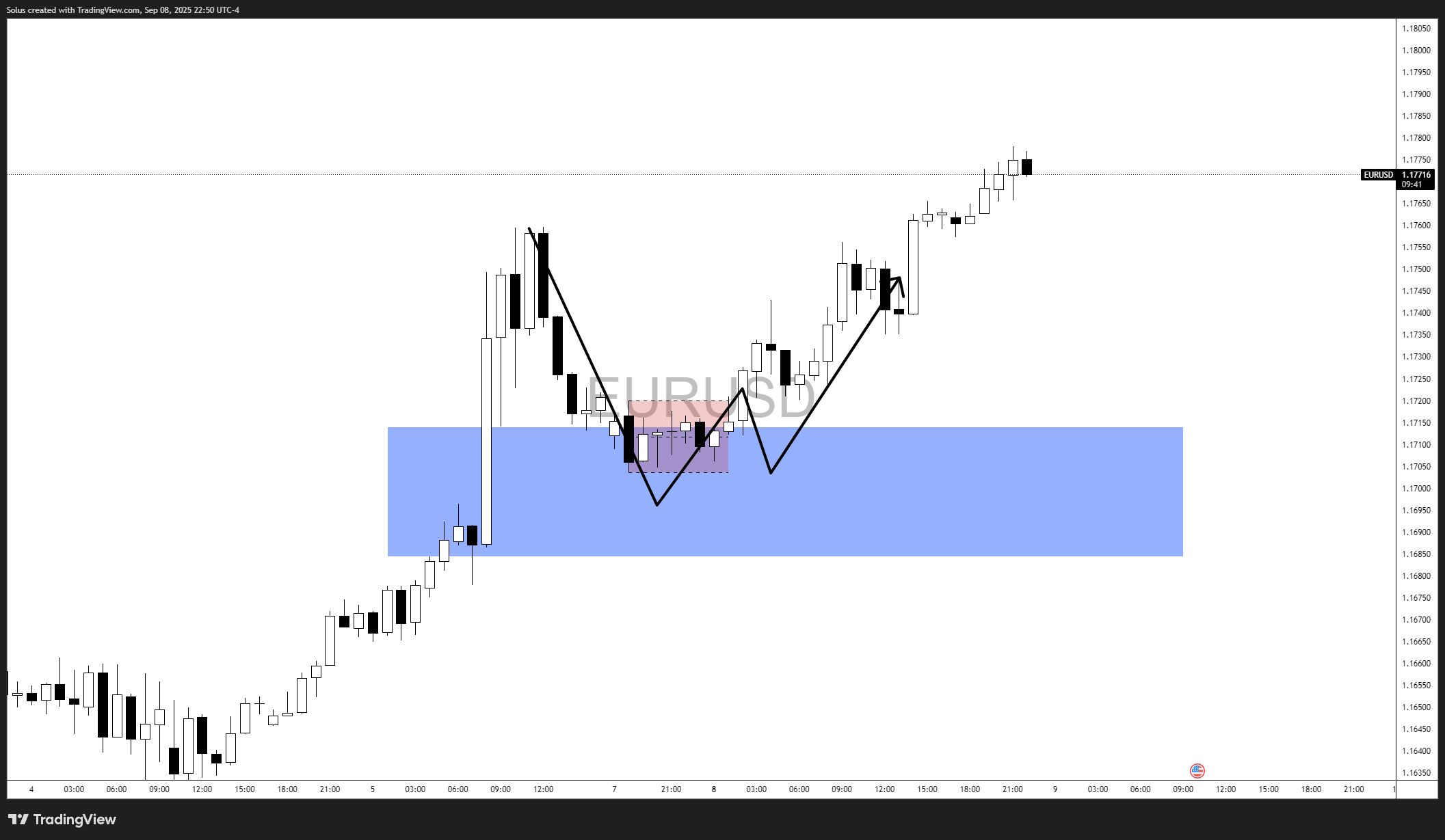 On Monday, we highlighted the blue demand zone (around 1.16844–1.17141) as the critical area for a potential bullish reversal. The forecast anticipated that if EUR/USD respected this demand zone, price could build a base and push higher toward the 1.1760–1.1780 region.