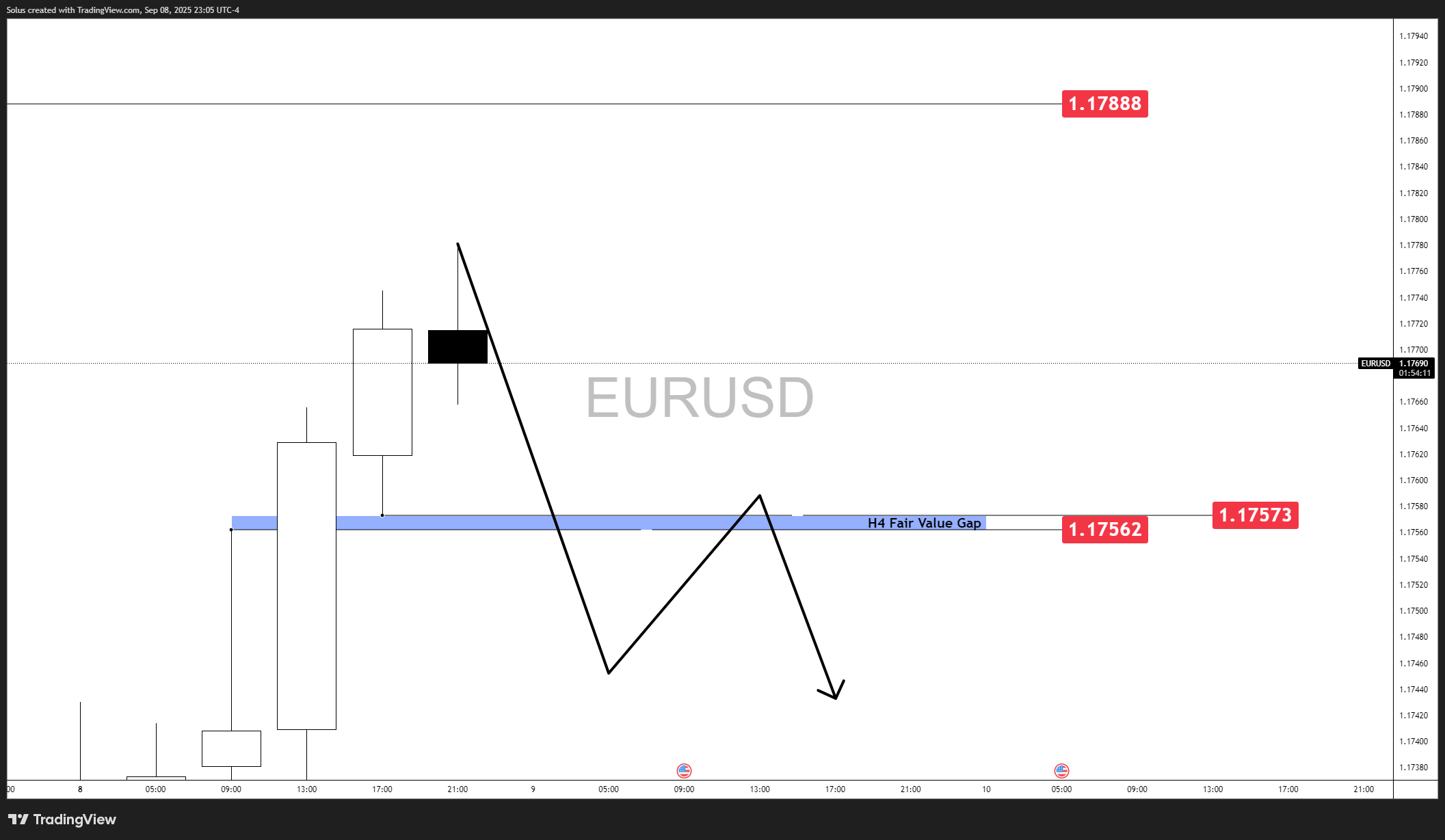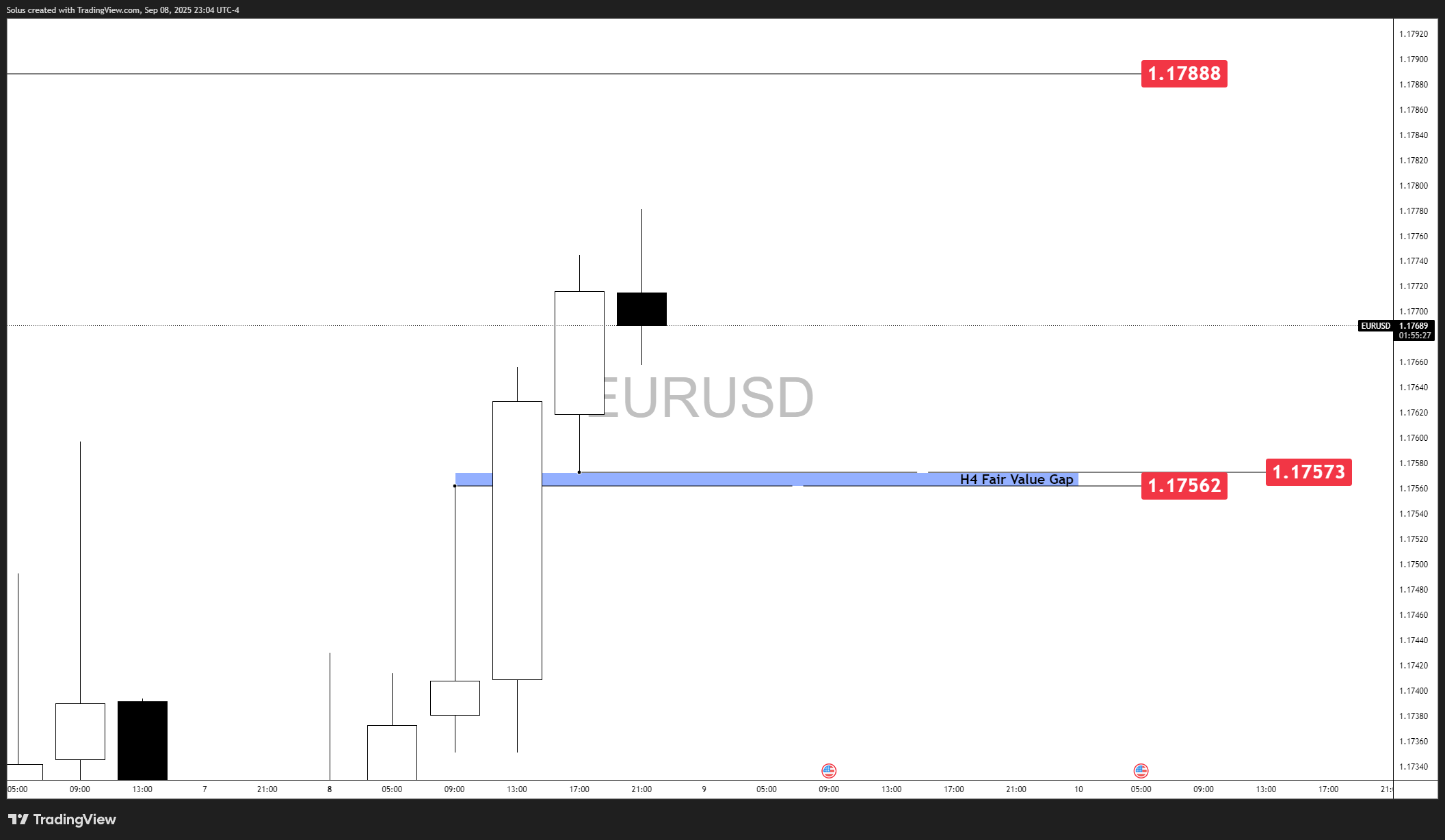 - Price fails to hold the H4 Fair Value Gap and breaks below 1.1750.