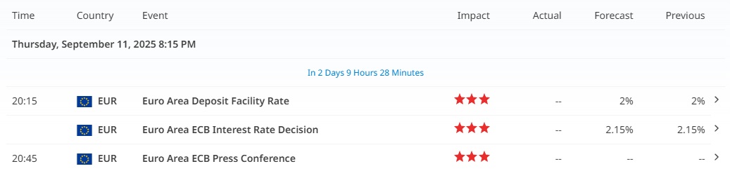 The European Central Bank (ECB) is pricing in a deposit rate unchanged at 2.15% this week, halting the easing cycle that had been underway since mid-2024. Inflation in the Eurozone ticked up to 2.1% in August, slightly above target, which reinforced policymakers’ decision to pause.