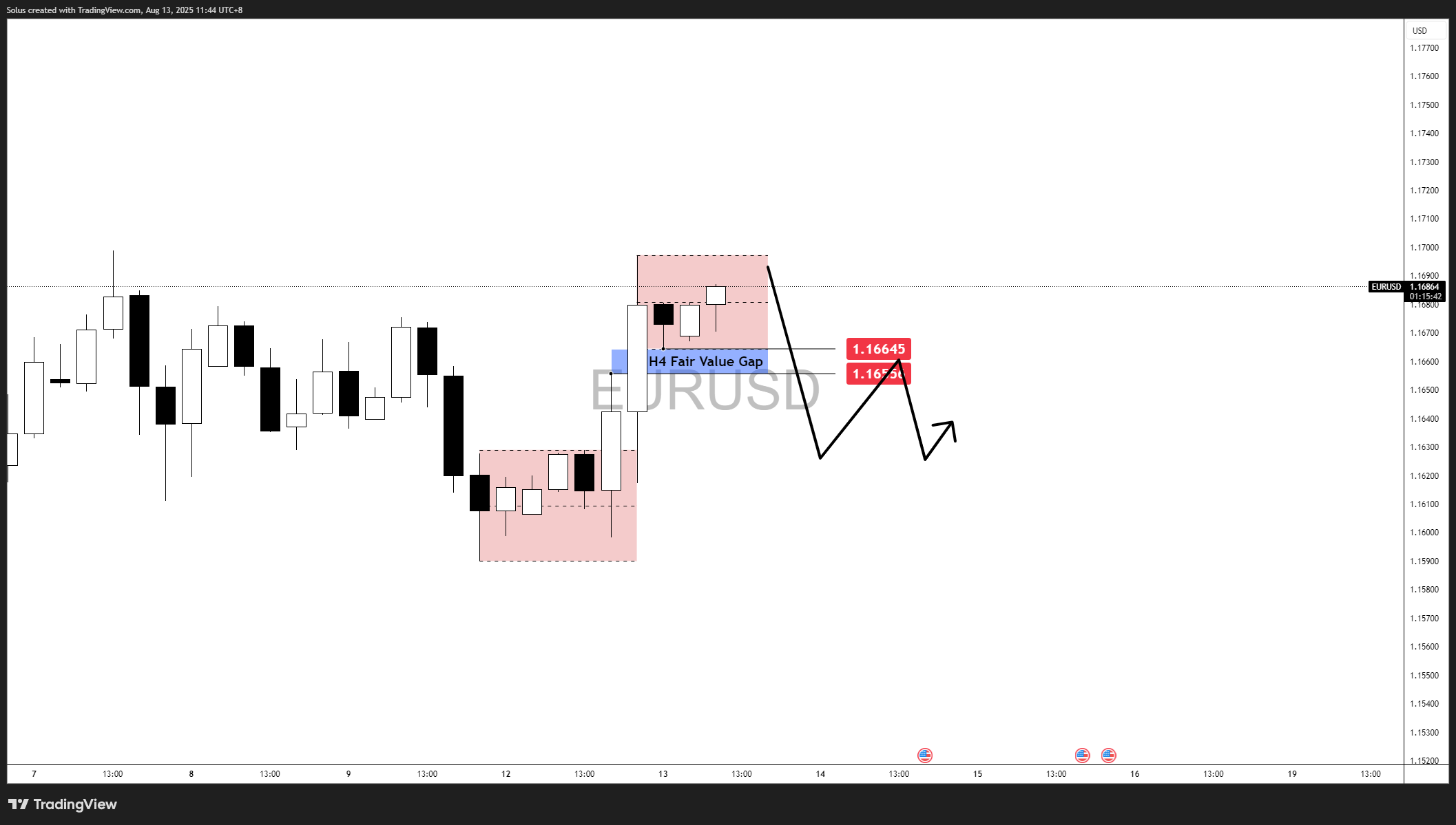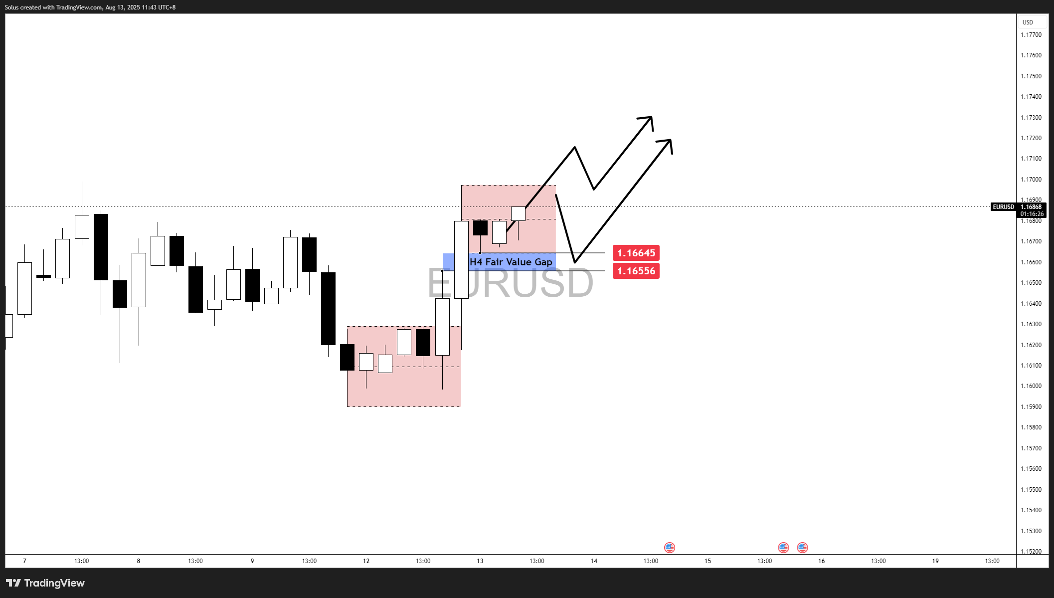 EUR/USD is currently consolidating just under the 1.1700 breakout level after a sharp rally from the August 12 lows. Price is holding above the H4 Fair Value Gap (1.16556 – 1.16645), which is acting as a key intraday support zone.