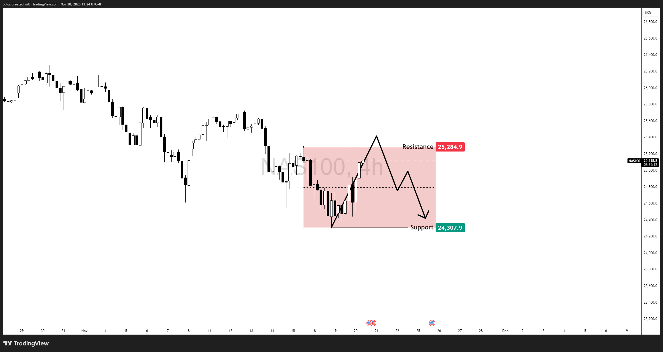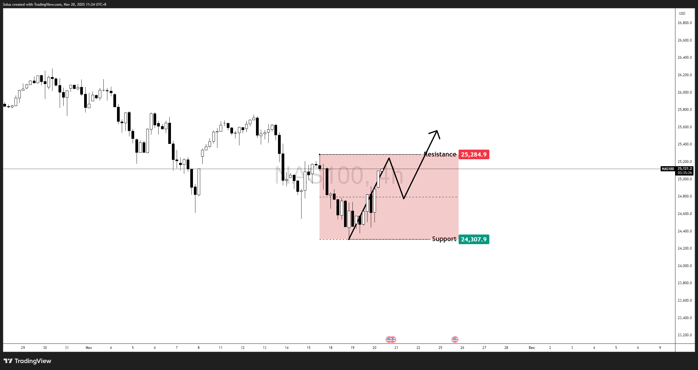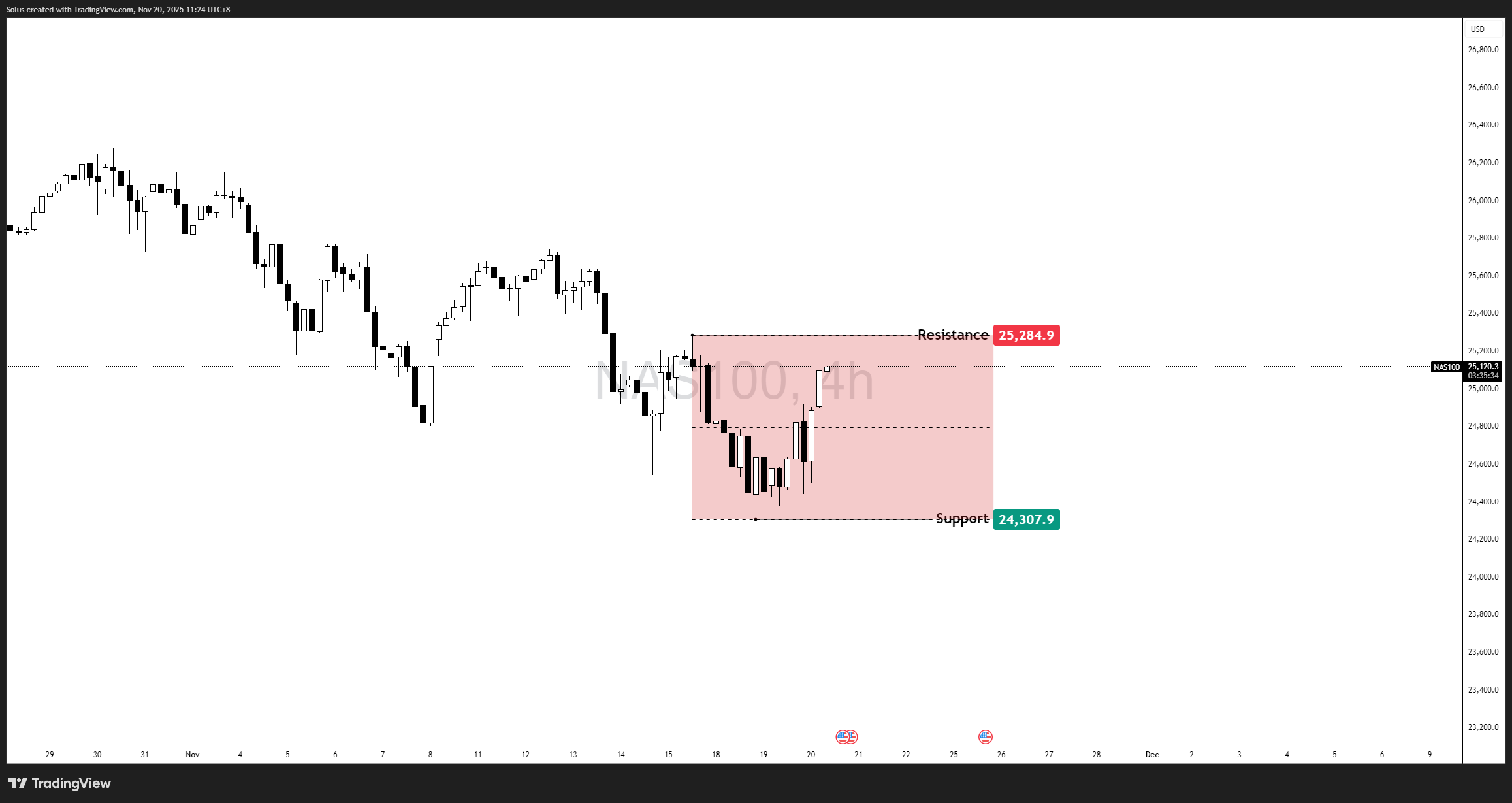 The Nasdaq 100 spent the past few sessions recovering strongly from its November lows, rebounding from 24,307 and climbing back into the 25,100–25,150 mid-range zone. While the candles look convincing, the broader picture reveals a different story: the index remains trapped inside a 4H range structure, boxed between 24,307 (support) and 25,284 (resistance).