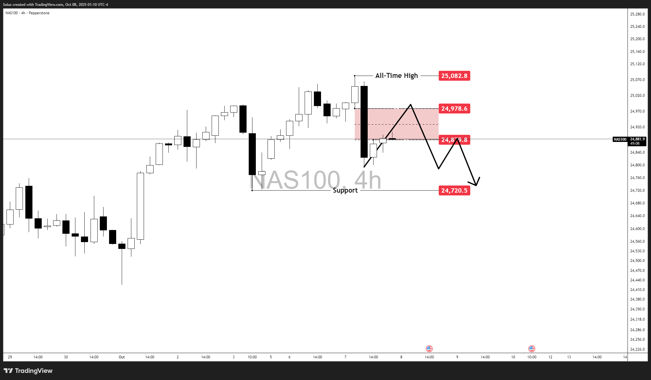 The Nasdaq 100 (NAS100) remains in a cooling phase, but price action does not yet confirm a reversal. The recent sharp drop from the all-time high near 25,080 created a visible fair value gap (FVG) between 24,879 – 24,978, which price is now retesting.