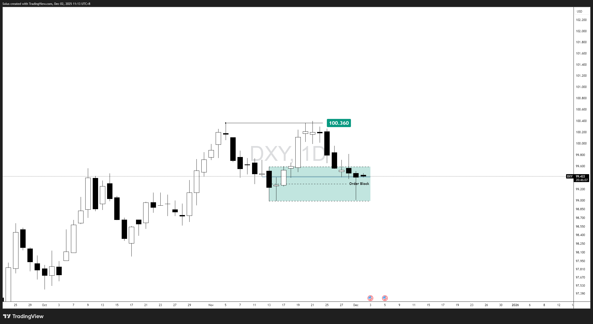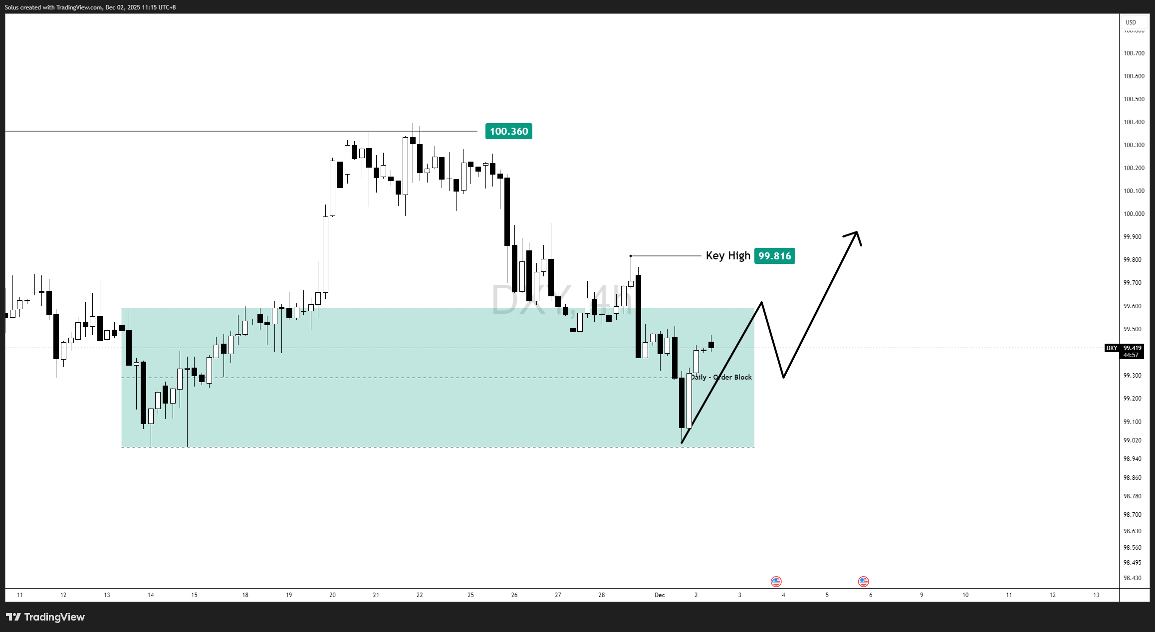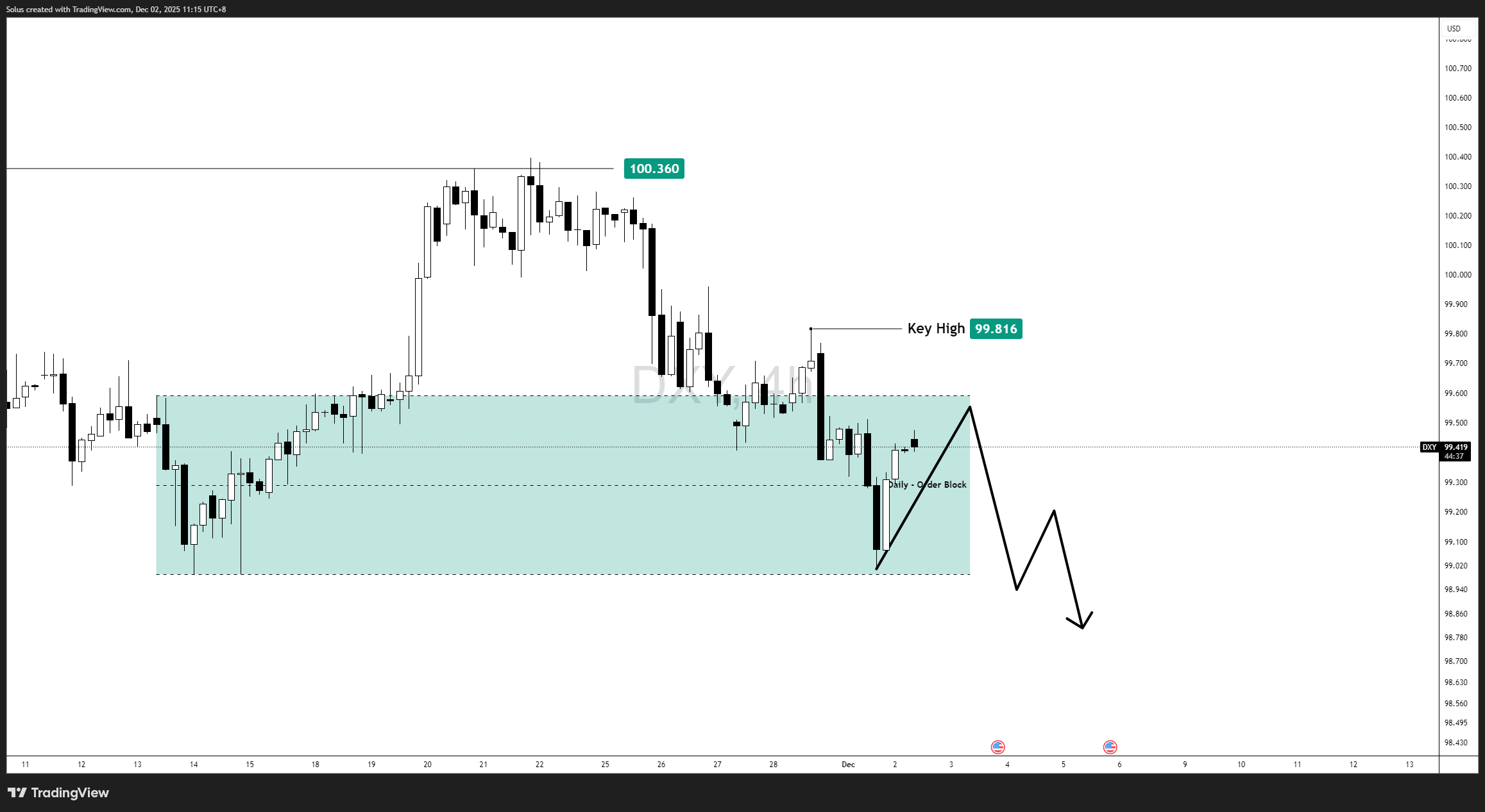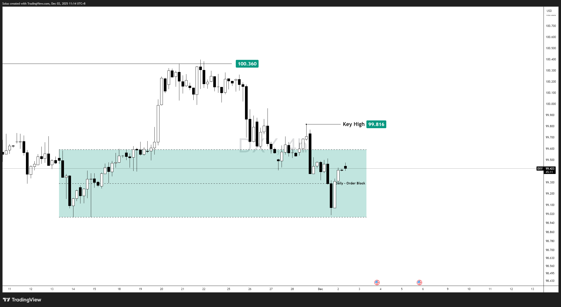 The recent price action shows DXY trading inside a wide daily order block between approximately 99.20 and 99.60. While the dollar managed a short-term rebound after tapping the lower boundary, it has since struggled to hold above the 99.80–99.816 key high.