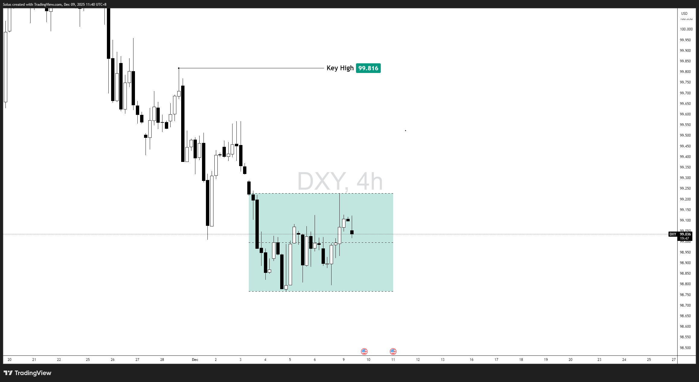 Instead, DXY is locked inside a well-defined 4H range, waiting for the next policy signal to determine its direction.