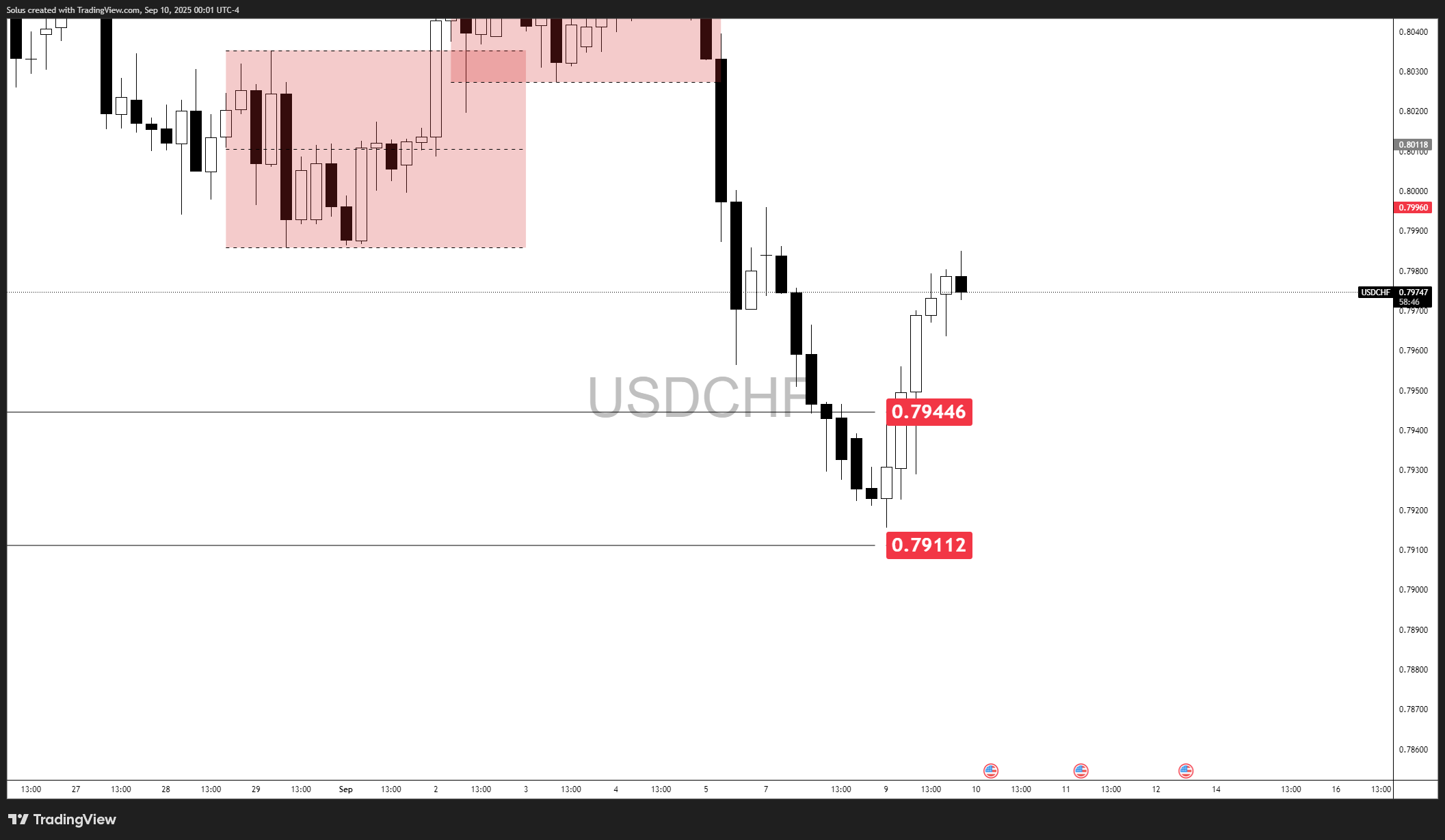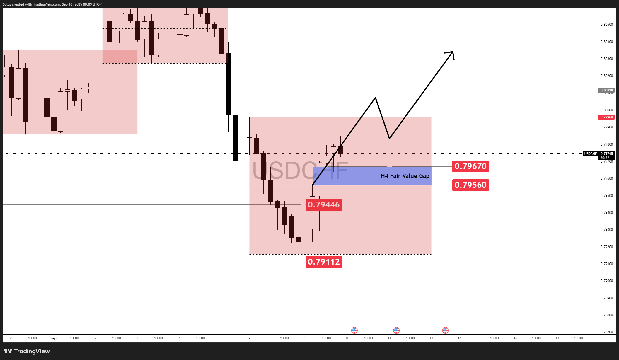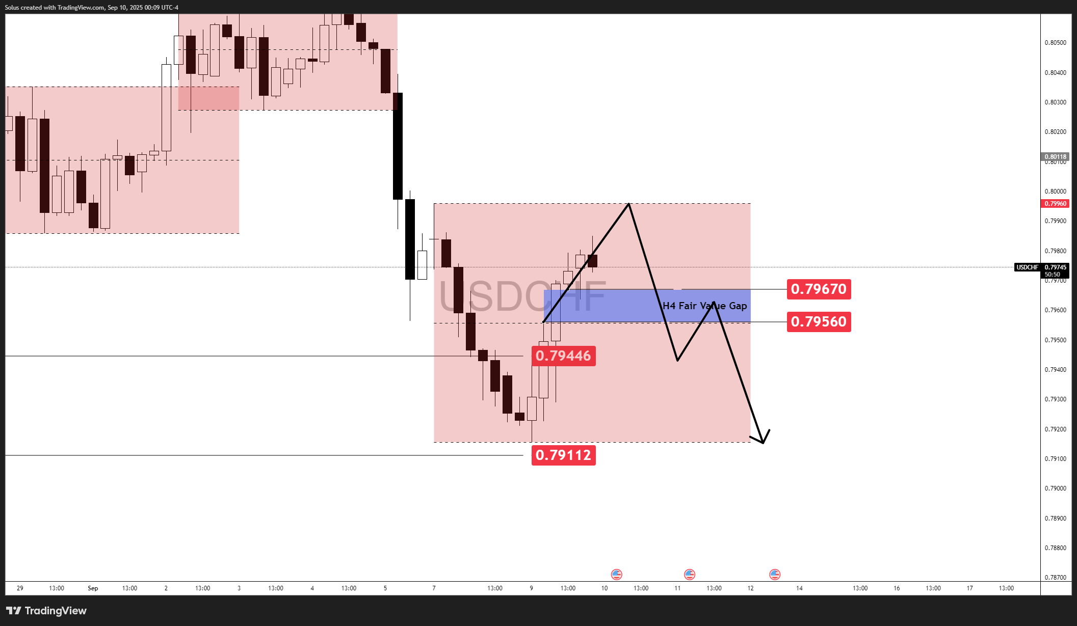 - USD/CHF bearish bias intact below 0.7967 FVG; bulls need reclaim above 0.8000, bears target 0.7911 liquidity.