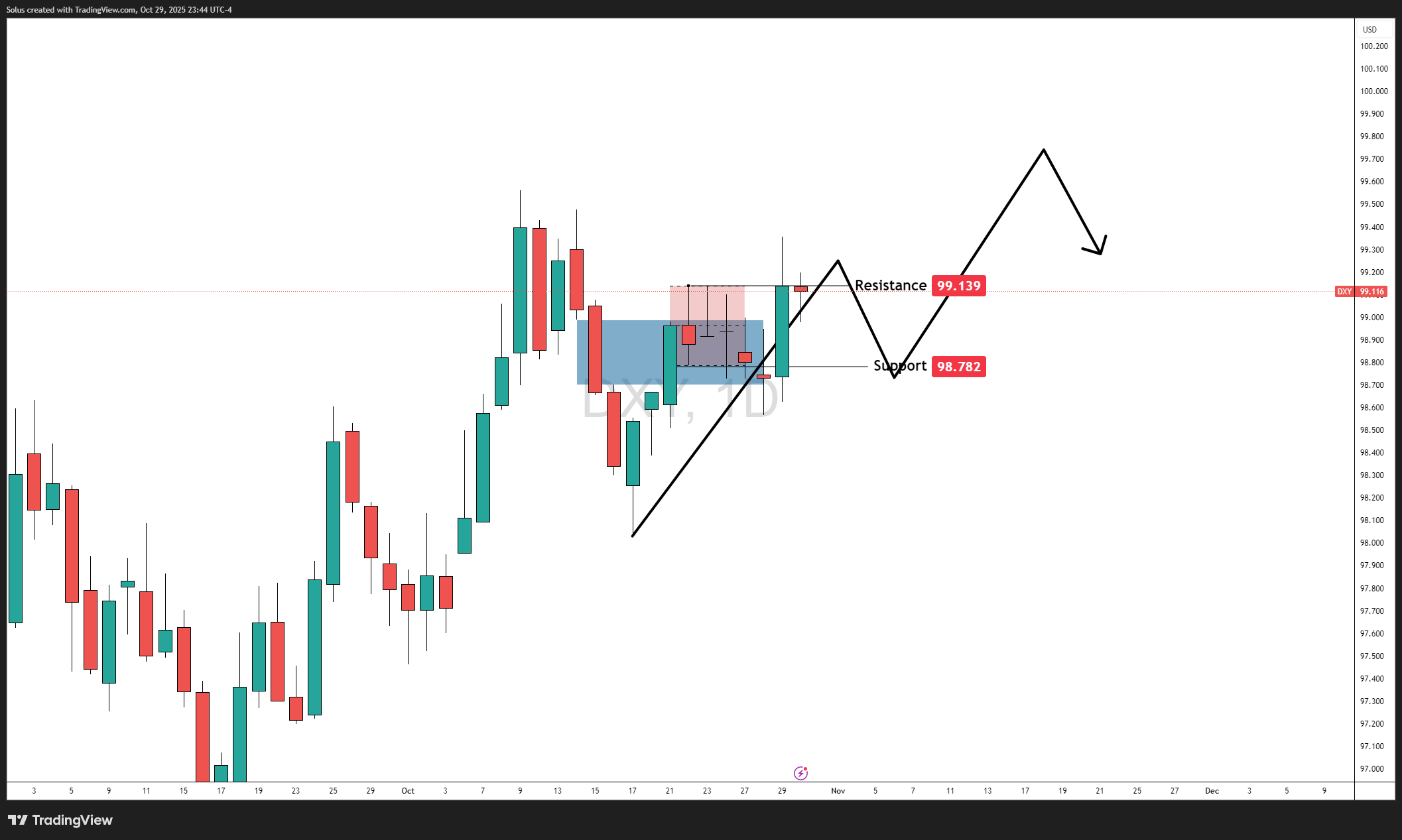The U.S. Dollar Index is defending the 98.60–98.80 support area, forming higher-low structure on the daily timeframe.