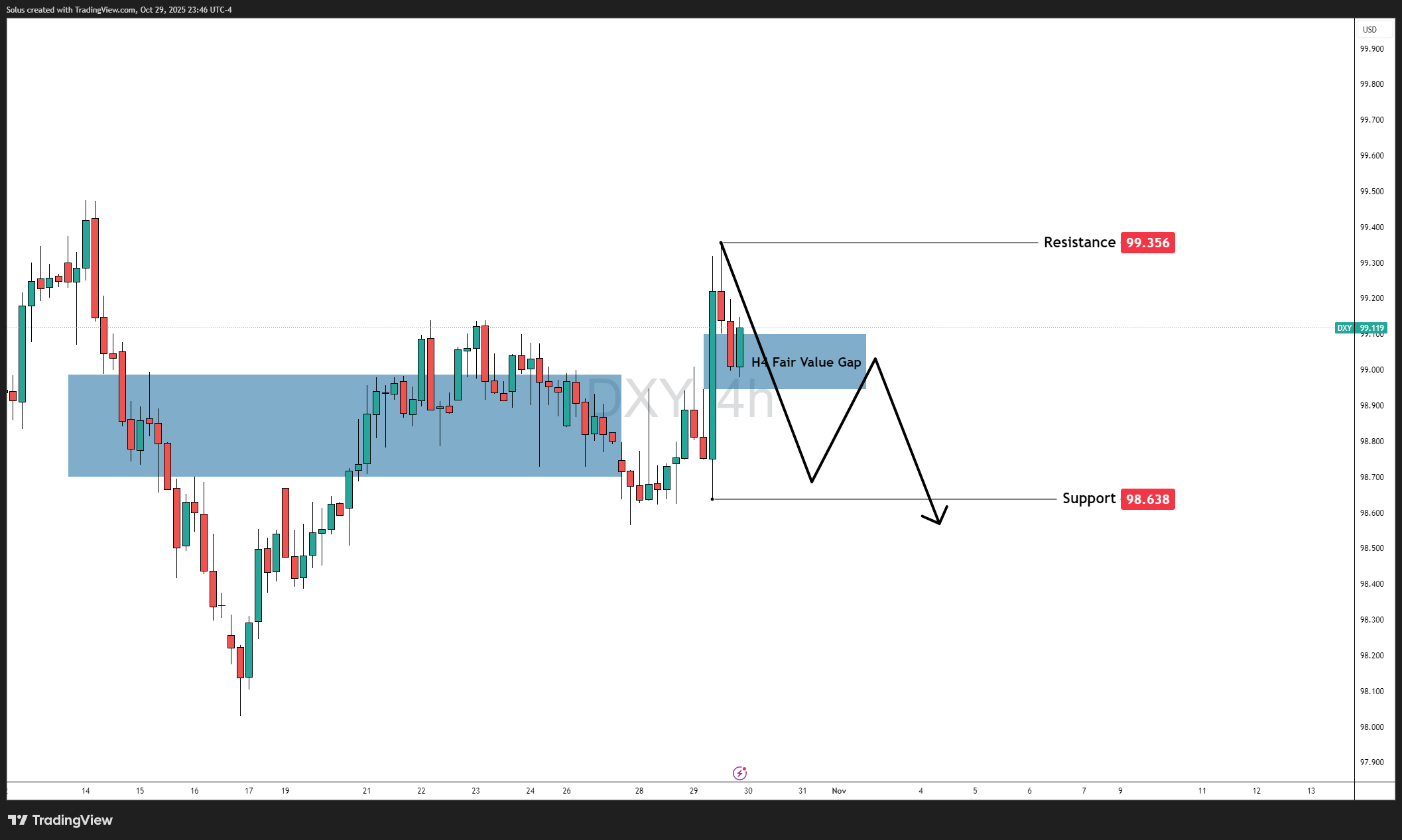 - DXY holds above key support, trading inside a 4H FVG between 98.63–99.35 with a bullish bias.