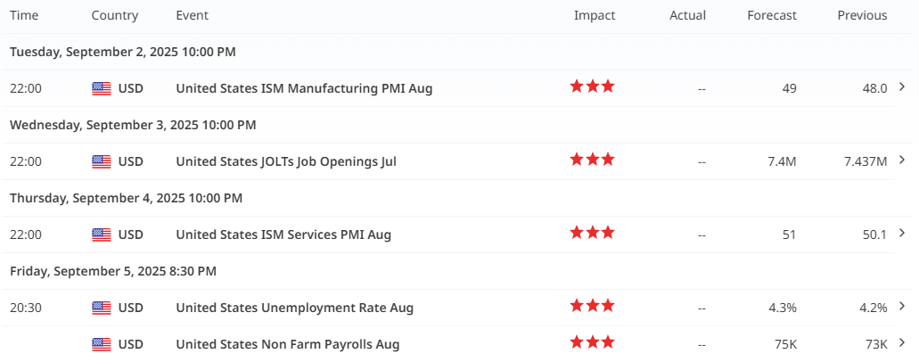 - Sept 3 – JOLTs Job Openings (Jul): Forecast 7.4M vs. 7.437M, hinting at cooling labor demand.