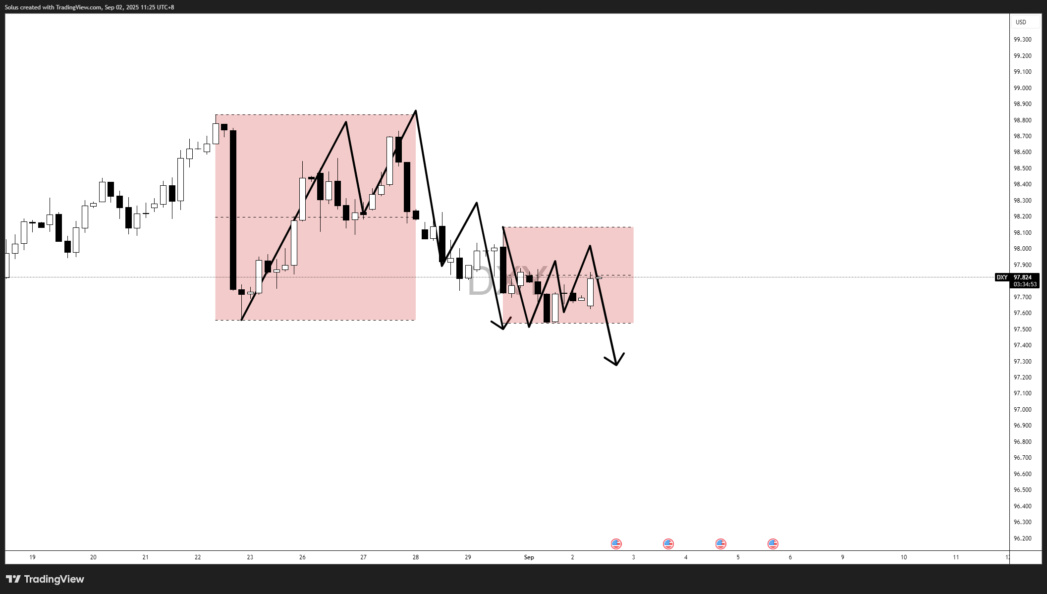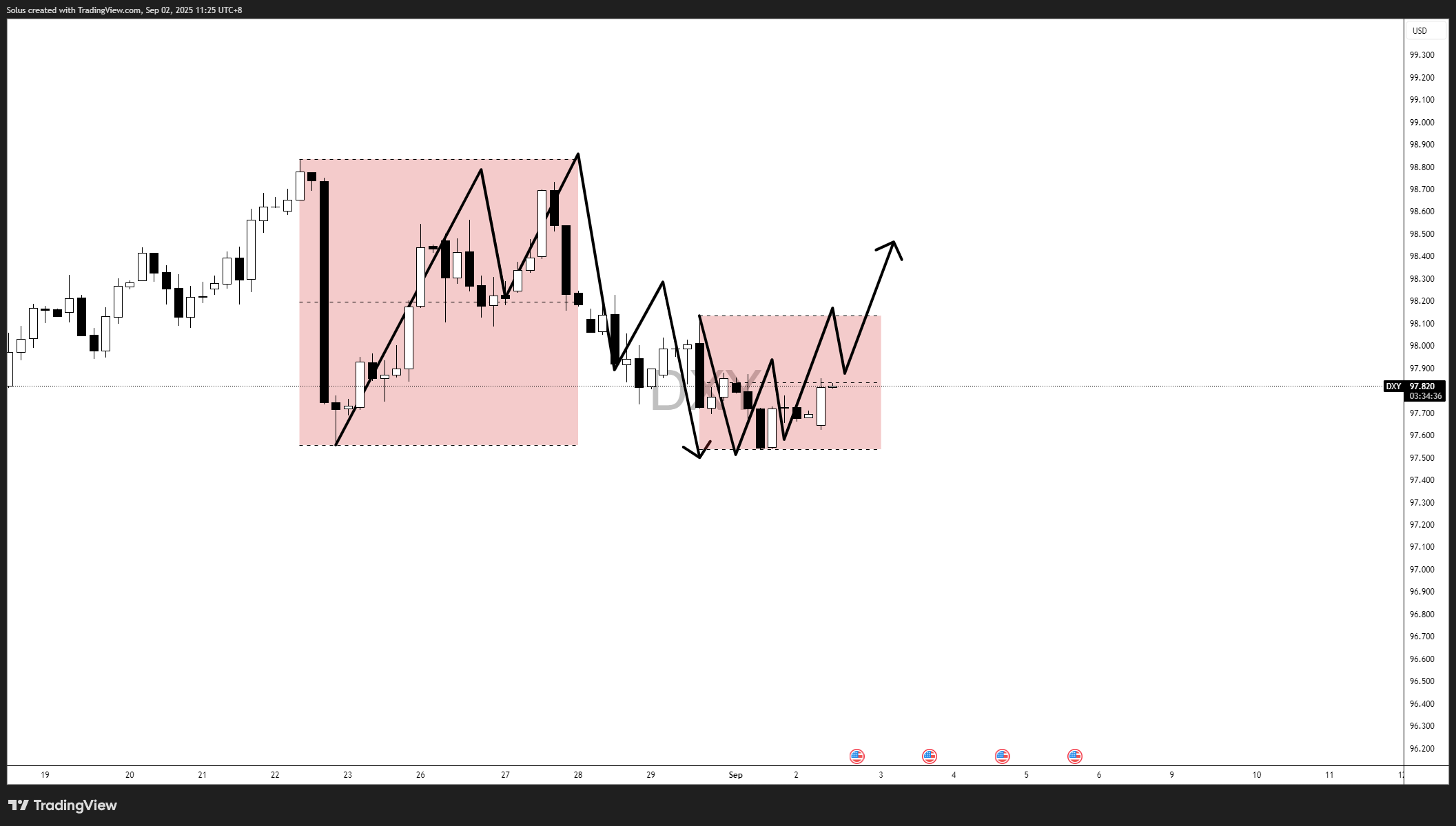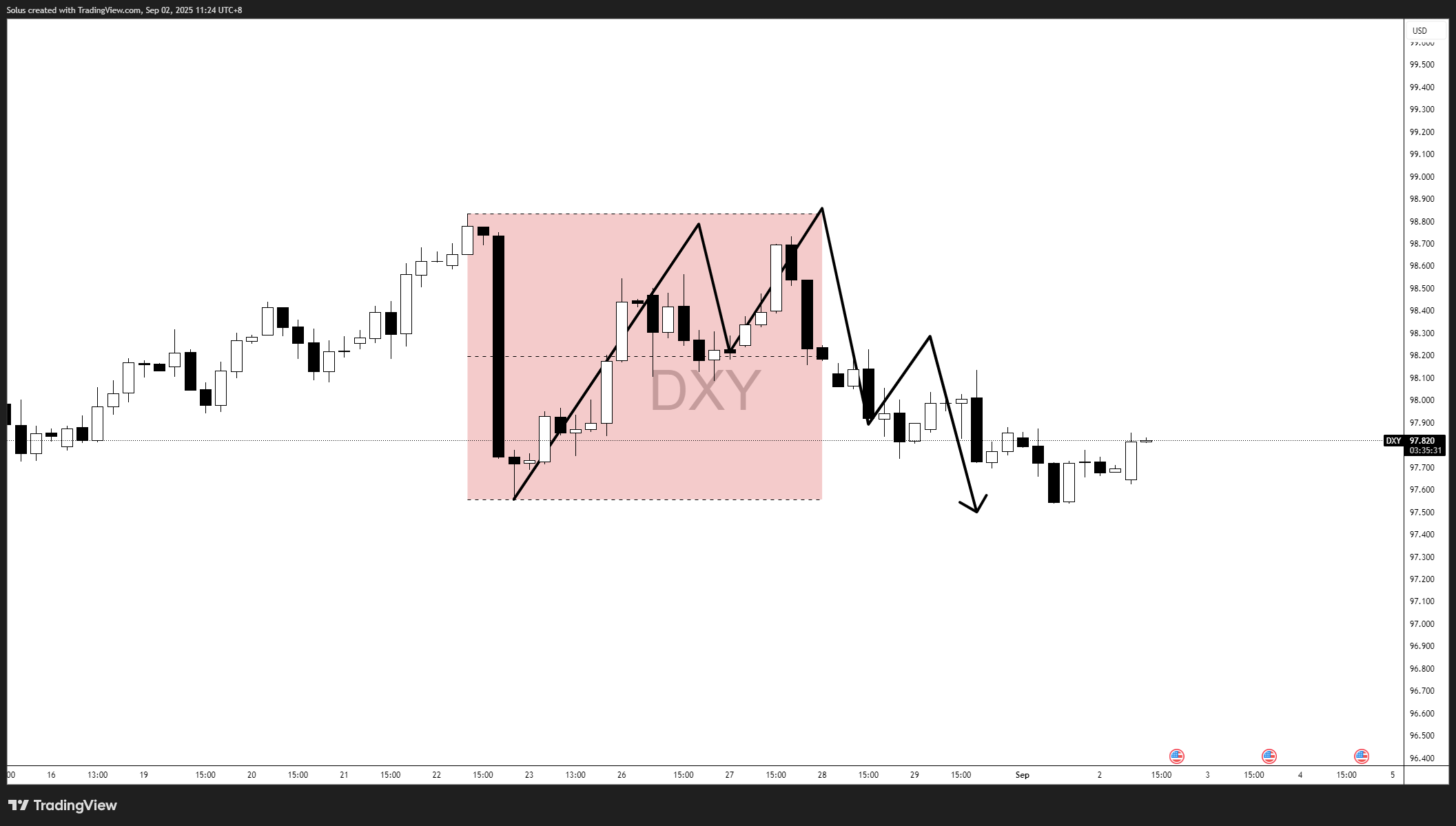 On August 26, we mapped a scenario where DXY would reject the 98.40–99.00 supply zone, form distribution, and then rotate lower into the 97.80 handle.
