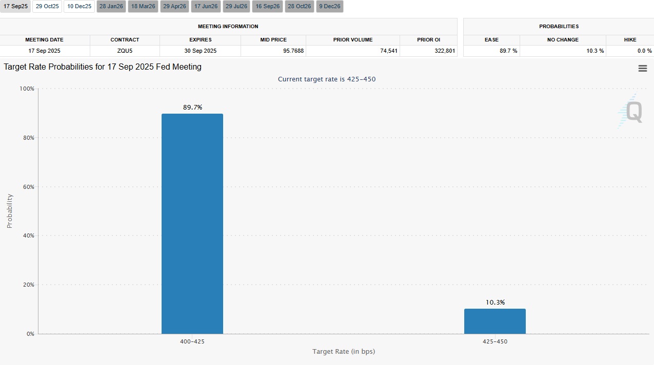 - CME FedWatch shows 89.7% probability of a September Fed rate cut, anchoring a dovish USD bias.