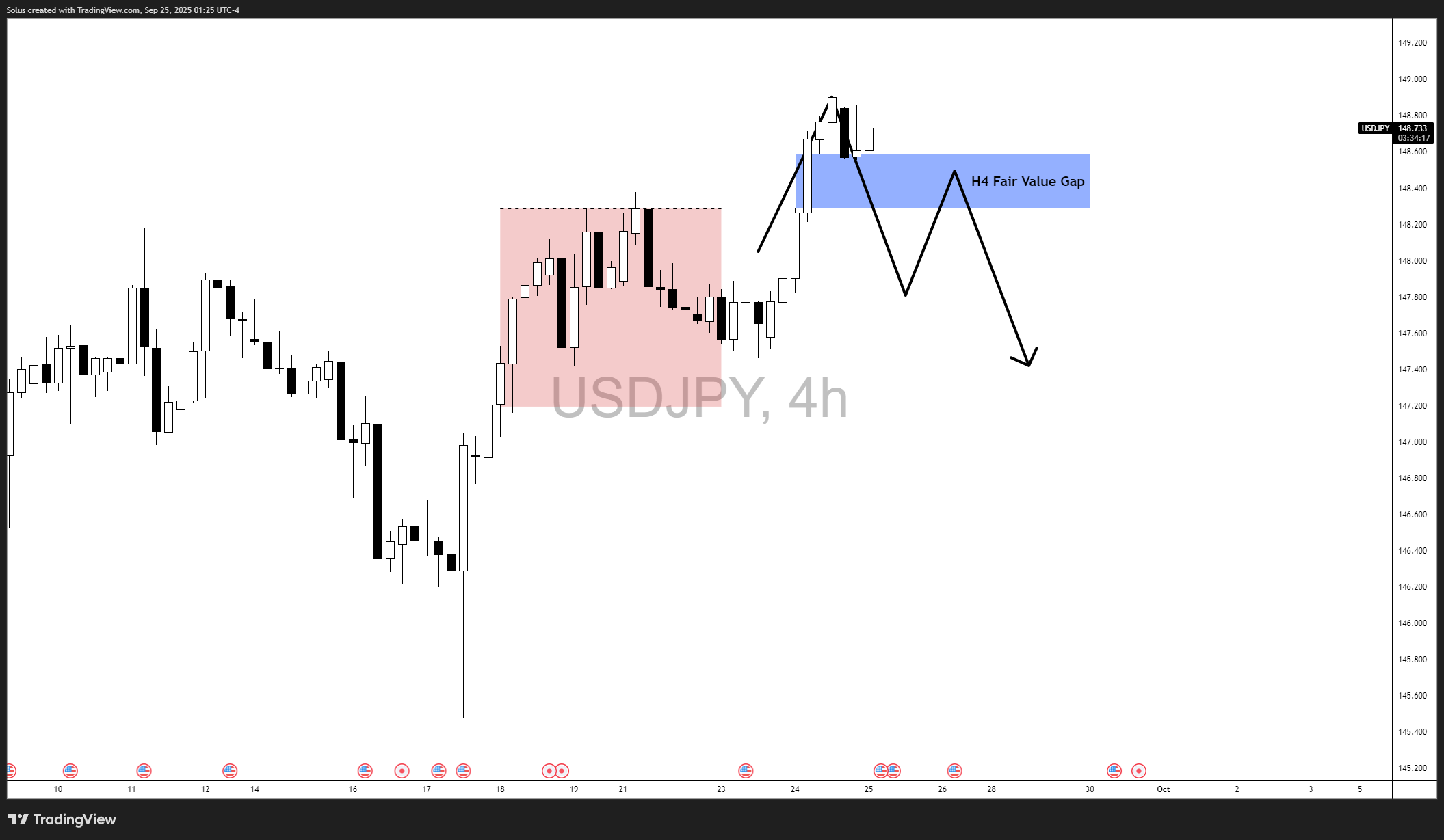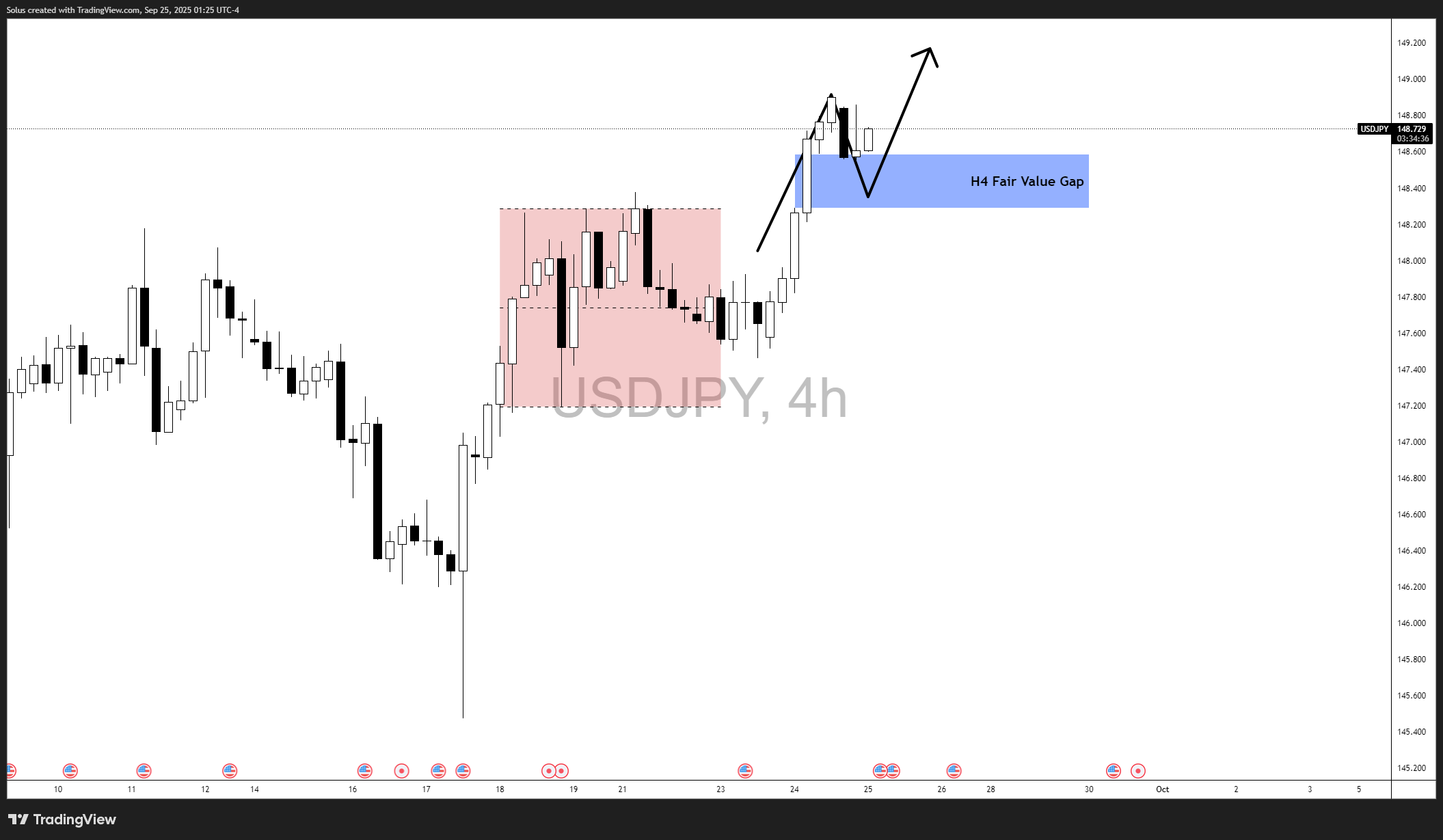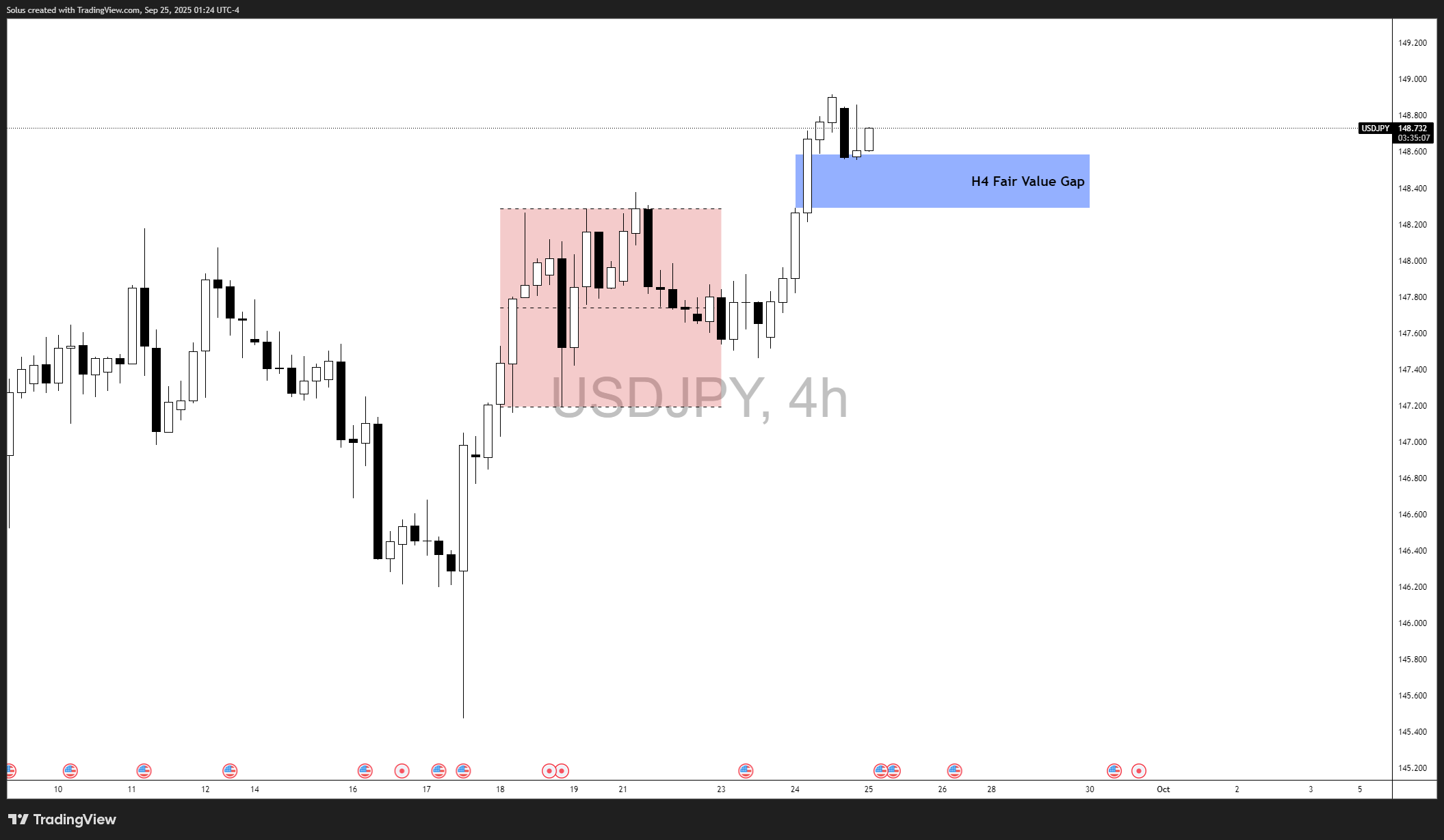 The pair is consolidating inside an H4 Fair Value Gap (148.291–148.587).
