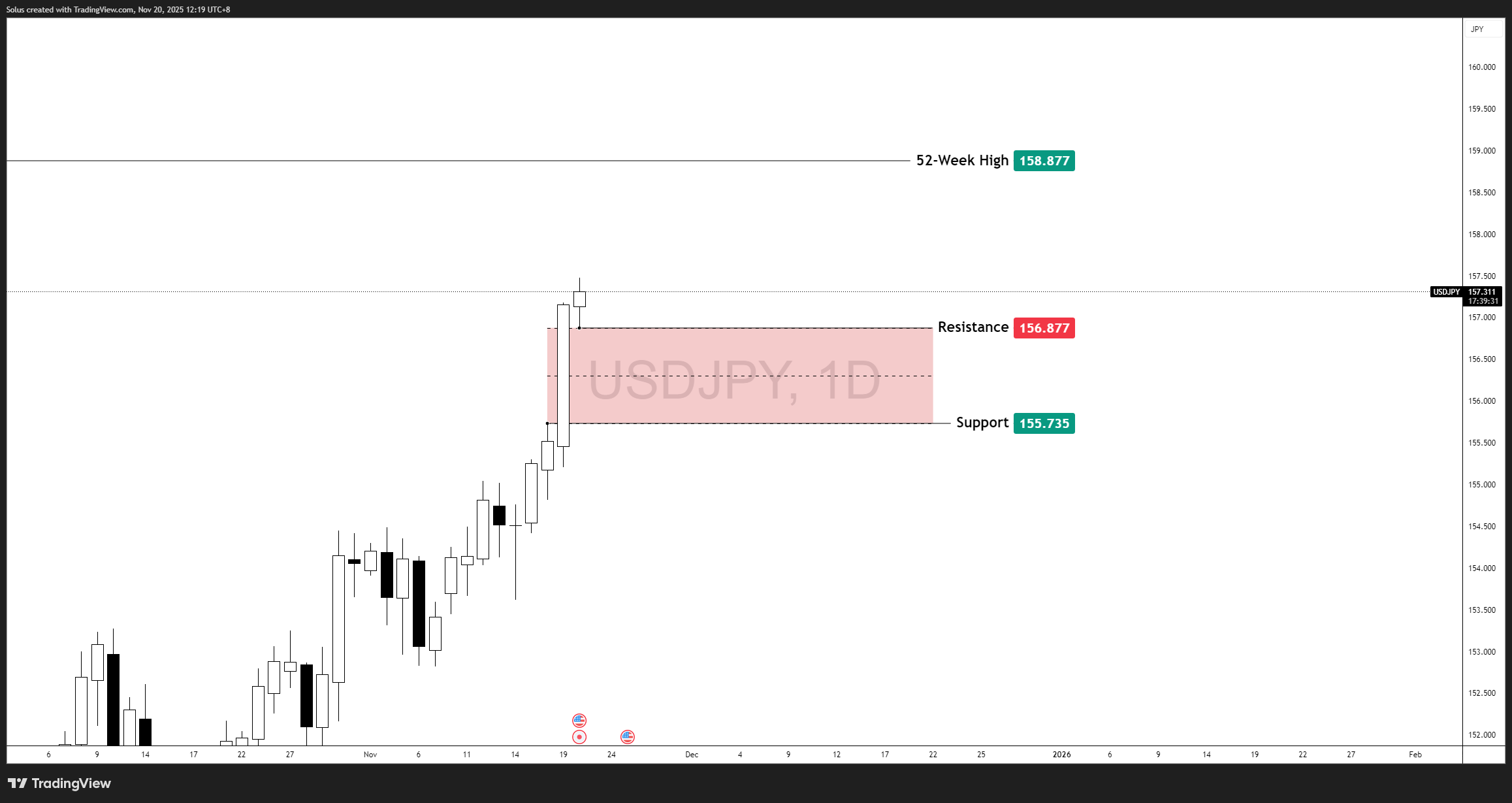 USDJPY stays firmly bullish, but the rally is extended. With the 52-week high just overhead, the market may need a reset before attempting a decisive breakout. The 155.70–156.80 zone is the key technical area to monitor — a bounce there maintains the trend, while a breakdown signals deeper correction.