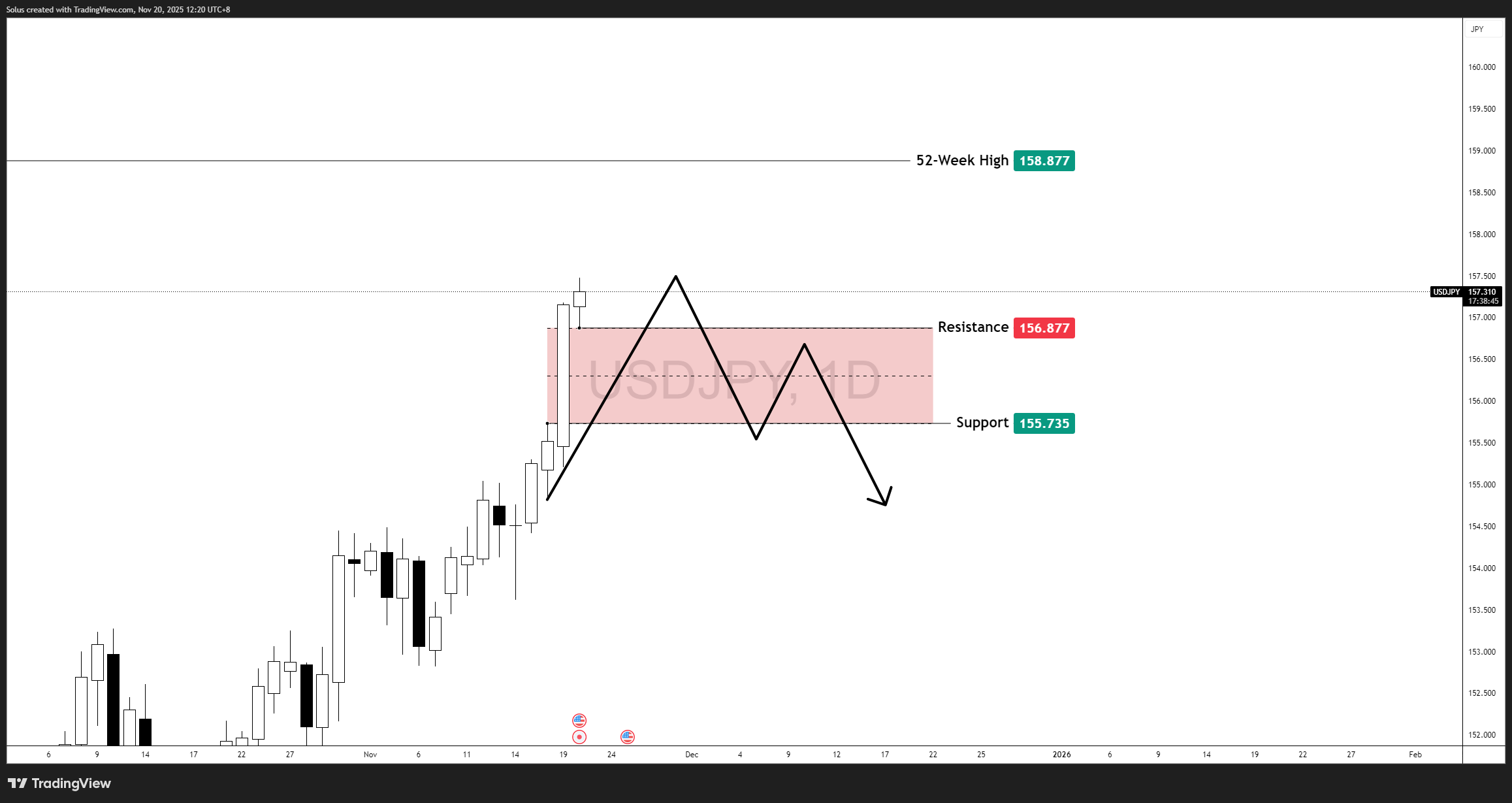 The recent push into the upper 157s shows the same pattern we’ve seen for weeks — strong impulsive legs with shallow corrections. While this speaks to persistent demand for USDJPY, it also raises the question: is a deeper retracement due before a breakout attempt on the 52-week high?